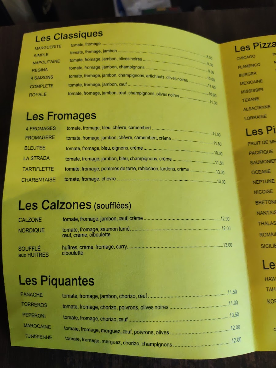 La Scala in Saint-Georges-d'Oléron offers a diverse and enticing menu with a range of classic and unique dishes to suit all tastes. Their Les Classiques selection features favorites like the Marguerite, Napolitaine, and Regina 4 Saisons. For cheese lovers, the 4 Fromages, La Strada, and Charentaise pizzas are excellent choices. The Pizzas du Boucher category includes hearty options such as the Chicago, Burger, and Tartiflette, while seafood enthusiasts will enjoy the Fruit de Mer, Pacifique, and Océane Niciose pizzas from Les Pizzas de la Mer. For a warm, folded option, the Calzone and Nordique calzones are available. For those who crave a little spice, the Panache, Marocaine, and Tunisienne pizzas from Les Piquantes offer a delightful kick.